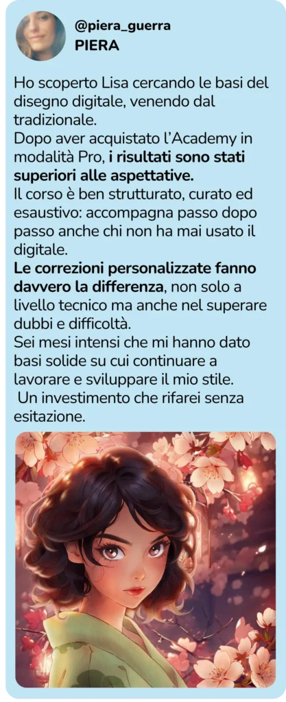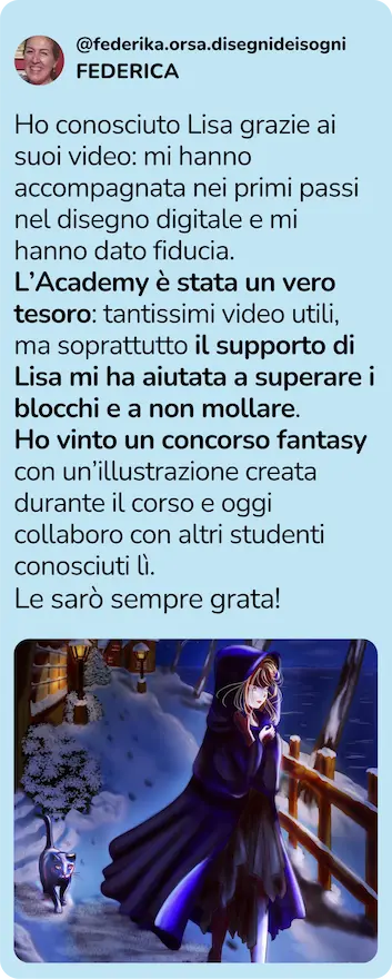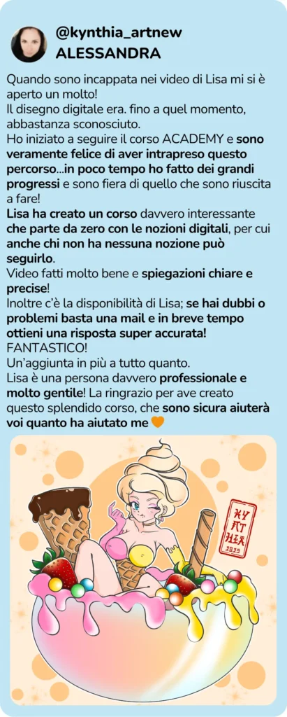 Mi chiamo Lisa e sono un'illustratrice digitale (coach di disegno digitale) da oltre 20 anni.
